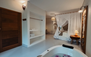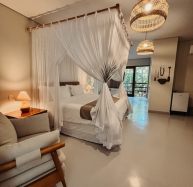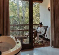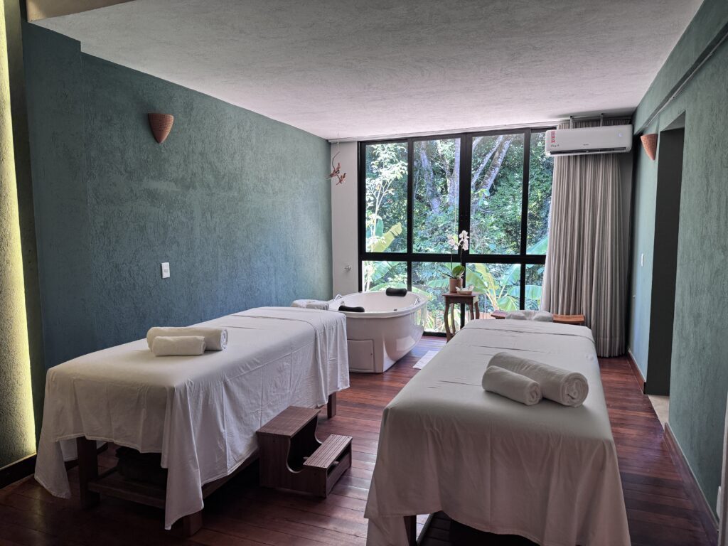 Suítes com banheira e varanda privativa vista natureza. Apartamentos completos com cama super king, ar-condicionado, TV LED 42” com canais SKY, minibar, telefone, cofre e secador de cabelo. Acomoda até 2 pessoas.